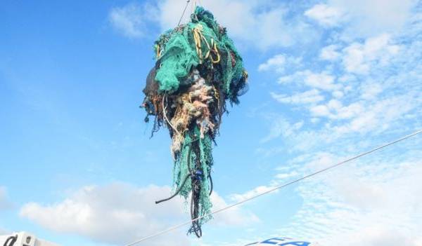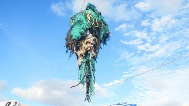 De los 1,8 billones de trocitos de plástico, algunos son más grandes que los microplásticos, incluidos pedazos de redes de pescar, juguetes e incluso un asiento de inodoro.