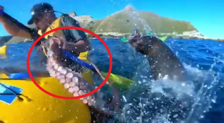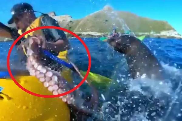 Las imágenes de un león marino de Nueva Zelanda que golpea a un piragüista con un pulpo han causado furor en las redes sociales en las últimas horas.