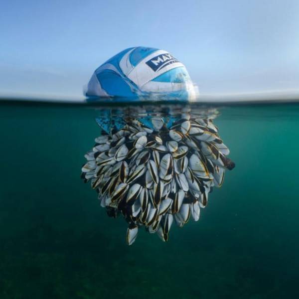 "Sobre el agua hay sólo una pelota de fútbol, pero debajo de la línea de flotación hay una colonia de criaturas. La pelota de fútbol fue arrastrada a Dorset (en el sur de Inglaterra) después de un gran viaje por el océano a través del Atlántico", dice Ryan Stalker, autor de la imagen.