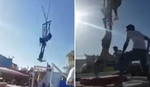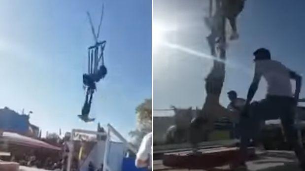 Las imágenes muestran a una mujer balanceándose en una de las atracciones, un gigantesco columpio que oscilaba llevando a sus ocupantes a grandes alturas. La joven había resbalado y únicamente era sostenida de los pies.