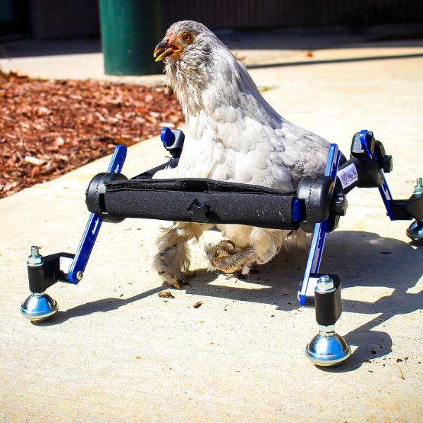 Una compañía de Amherst, Nueva Hampshire, especializada en sillas de ruedas para mascotas hizo la de la gallina.