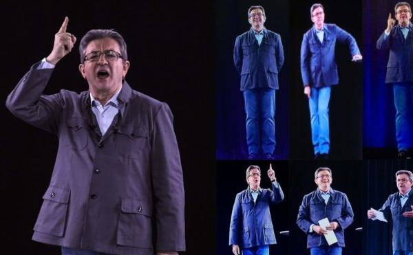 Pero Mélechon no se transporta en carne y hueso; lo hace de forma futurista con una proyección holográfica.