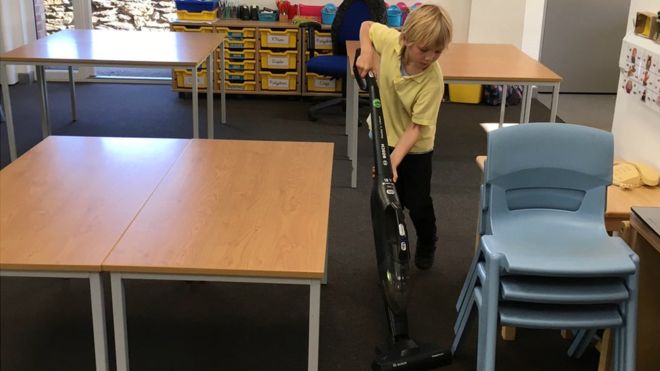 Noah tiene 6 años y es uno de los alumnos. Al ser preguntado si él y sus compañeros deberían limpiar el aula, dijo: "Sí, estamos protegiendo nuestra escuela".