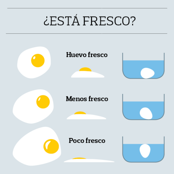 Los huevos viejos cambian de densidad, debido al aumento de espacio de la cámara de aire que hay entre la membrana interna y la externa. La cáscara del huevo nuevo es áspera y opaca. Cuando es viejo, es más lisa y gana brillo. Si el huevo está agrietado, deséchalo, para evitar riesgos sanitarios.