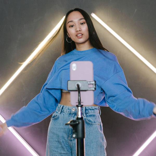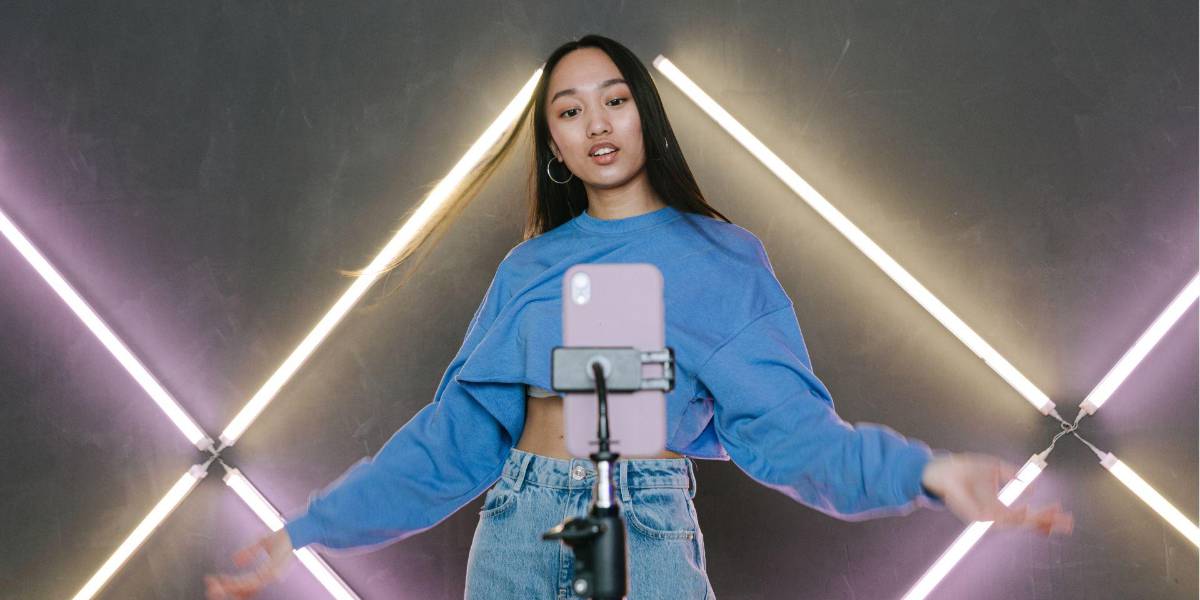 Imagen referencial de influencer grabando un video en su smartphone.( )