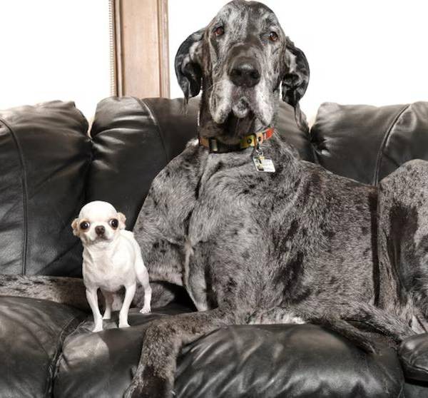 La inusual cita entre un gran danés de más de un metro de altura y una diminuta chihuahua de apenas nueve centímetros fue organizada por Guinness World Records en Idaho, Estados Unidos.