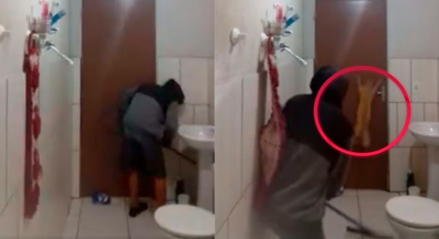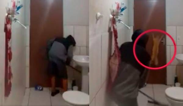 Al darse cuenta que no iba a lograr capturar al roedor, el adolescente corrió hacia la puerta, se sentó en el lavamanos para abrirla y salió. El gato, que también buscaba salir del reducido espacio, abandonó el lugar.