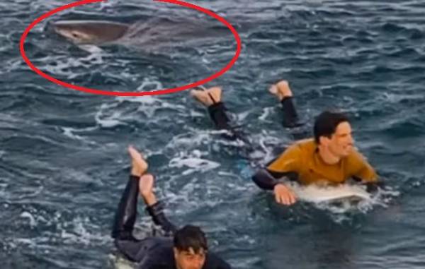 Un vídeo muestra al animal cerca de dos hombres que reman sobre sus tablas.