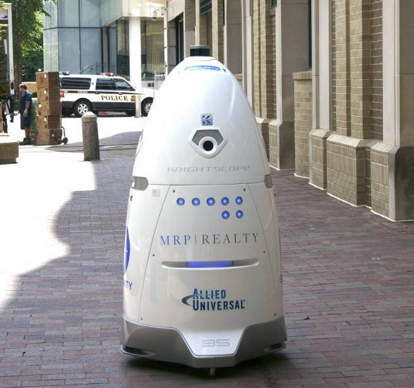 En su primer día de trabajo como guardia de seguridad Steve se cayó en una fuente. Pese al contratiempo, muchos creen que robots como Steve son la avanzada de una nueva era de máquinas inteligentes que harán cumplir la ley.