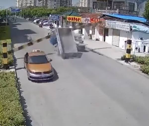 Un video de las cámaras de seguridad de una calle en la ciudad china de Taicang muestra cómo el conductor de un camión casi provoca la muerte de un hombre que caminaba al lado de la acera. El conductor contó que al entregar unas mercancías se olvidó de bajar la bodega de carga y que no se dio cuenta de que el vehículo no podía pasar la barrera.