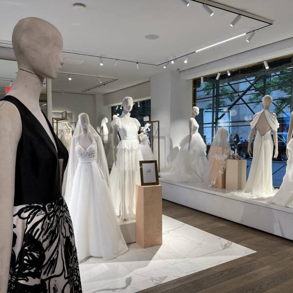 Fotografía de unos modelos de vestidos de novia expuestos, el 27 de junio de 2022, en una tienda de la empresa española Pronovias en Nueva York (EEUU). EFE/ Sarah Yáñez-Richards( )