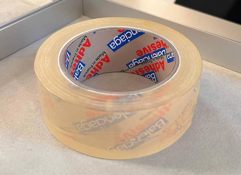 La colección otoño/invierno 2024-25 incluye esta cinta adhesiva como parte de sus productos. El accesorio fue modelado durante la semana de moda en París, la modelo lucía un vestido azul chillón con gris y un bolso animal print.