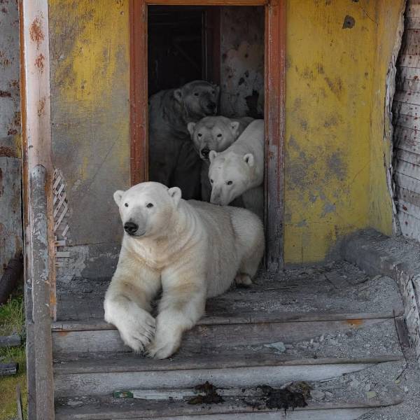 La estación de investigación científica fue establecida en la isla de Kolyuchin en 1943 y fue clausurada tras la disolución de la Unión Soviética en 1992, dejando atrás una serie de construcciones abandonadas. En el metraje de Makhorov, se puede apreciar a por lo menos cinco osos polares, incluidos oseznos, subiendo escaleras, asomando la cabeza por las ventanas y reposando en el perímetro de la base, utilizando las estructuras como protección contra el viento y otros elementos del clima ártico.