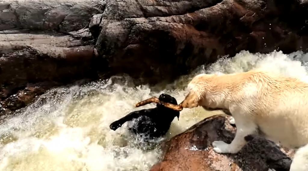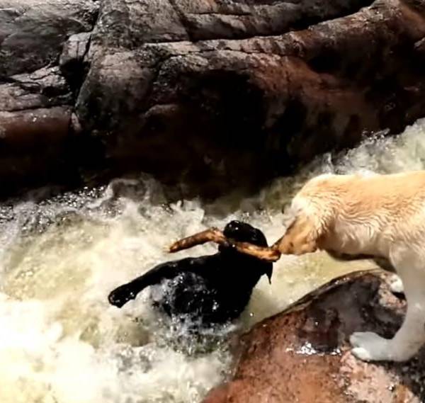 Un hábil perrito ayudó a su amigo a pesar del peligro. Según una nota del portal 24horas.cl, mientras paseaban por un río en Córdoba, Argentina, el dueño lanzó un palo para que su labrador lo alcanzara. El objeto cayó al agua y cuando el perrito quiso salir, la corriente comenzó a arrastrarlo.