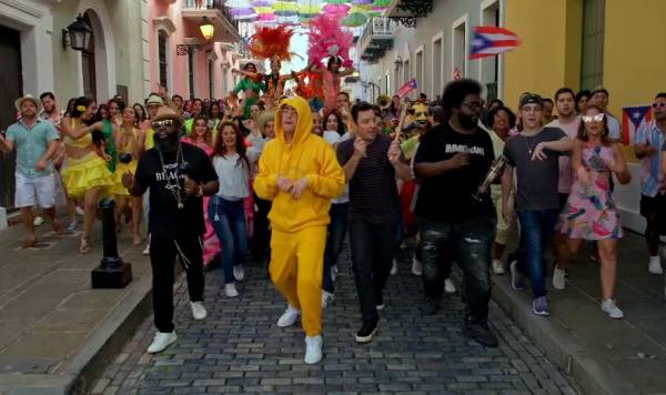 El video sirvió para presentar diversas facetas de las celebraciones de la isla, incluyendo turismo y gastronomía, hubo un momento que llamó la atención de todos. El trapero Bad Bunny y el animador Jimmy Fallon se unieron para interpretar el tema "Mía".