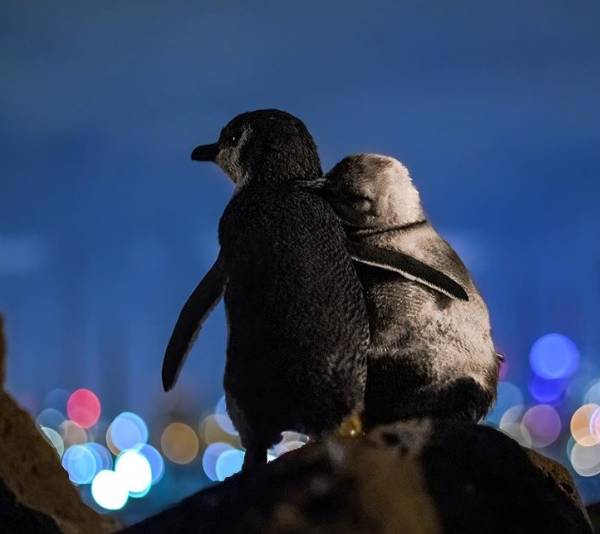 El fotógrafo Tobias Baumgaertner logró inmortalizar a una pareja de pingüinos que se abrazaban y observaban las luces del horizonte durante los tres días que pasó con una colonia de estas aves en Melbourne, Australia.