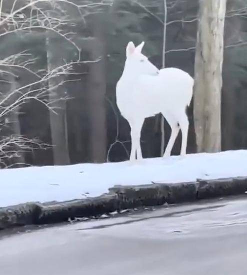 Un ciervo albino sorprendió a una mujer en una apartada carretera nevada en Carolina del Norte, Estados Unidos.