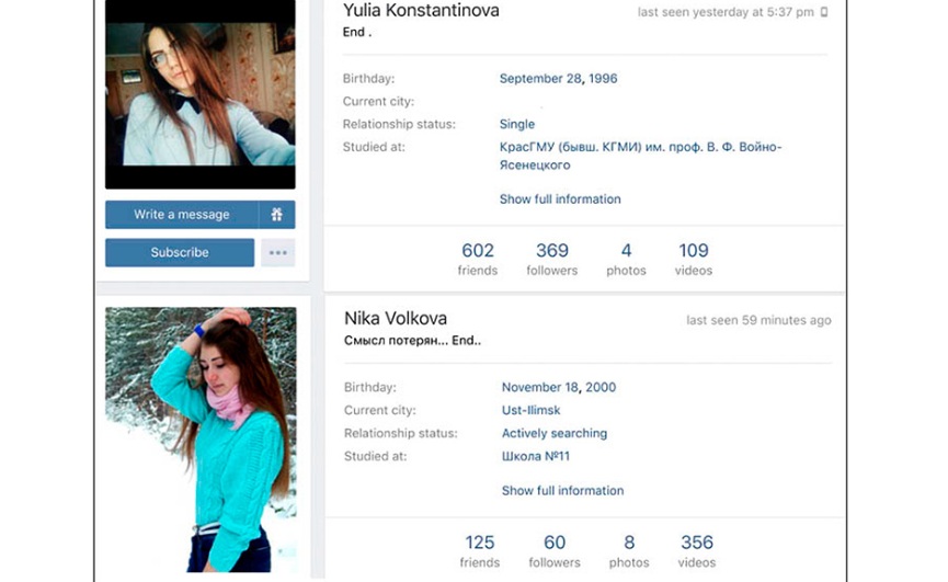 Las cuentas VK de Yulia Konstantinova y Nika Volkova. Ambas adolescentes rusas cometieron suicidio: el posteo de despedida de la primera fue “End” (Fin) -