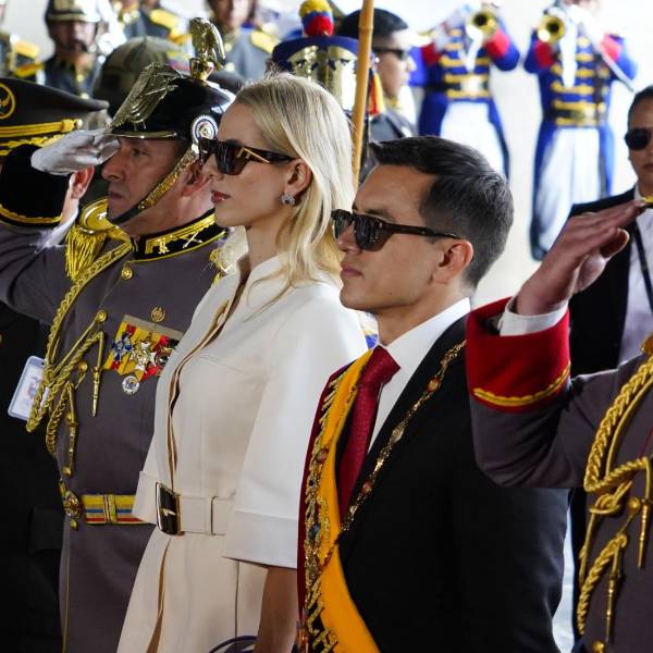 Imagendel Informe a la Nación 2024. Daniel Noboa y Lavinia Valbonesi con sus señaladas gafas.( )