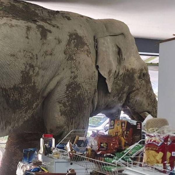 Se trata de un elefante salvaje, identificado por los locales como Plai Ari, protagonizó una escena poco común en la provincia de Nakhon Nayok, Tailandia, al meterse en una tienda, al parecer, en busca de algo para comer. Este particular visitante no es del todo desconocido en la zona, ya que según informes, no es la primera de sus travesuras.