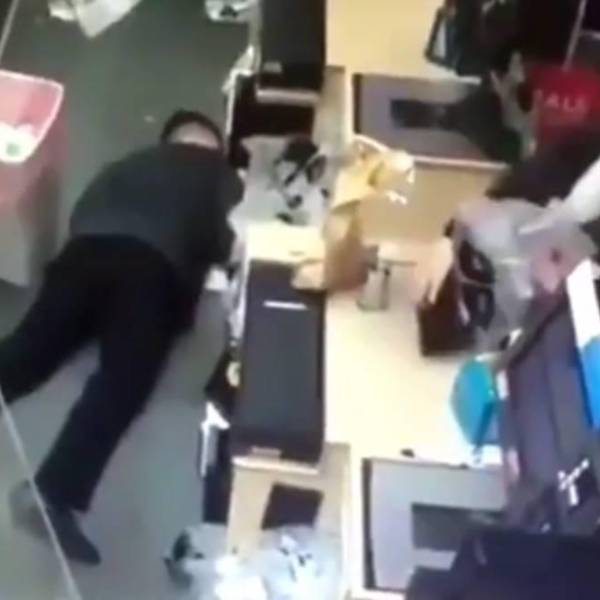 El usuario de Twitter ElpedroThe2nd compartió este jueves las imágenes, captadas por las cámaras de seguridad de la tienda, que muestran cómo el joven está trabajando en la caja y hablando con una mujer y, de repente, se lleva una mano a la cabeza y cae al suelo.
