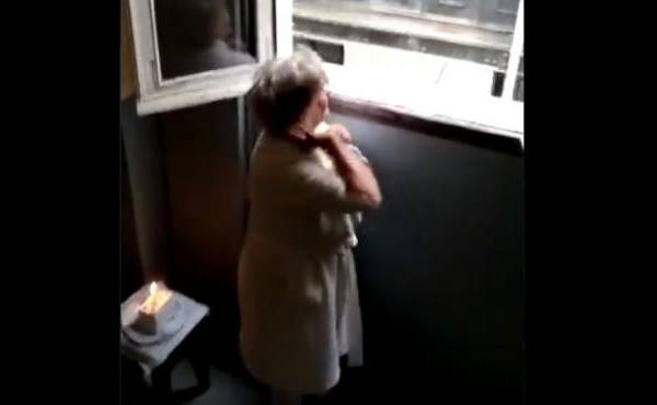 En las imágenes, se puede ver cómo los vecinos le han dejado en la puerta una tarta con una vela y le piden que salga a la ventana del portal. Fuera, el resto de personas le esperan en las ventanas de sus pisos para felicitarla.