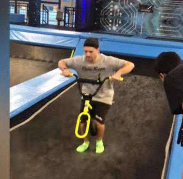 Él toma impulso y después salta para realizar una voltereta hacia atrás. Parecía que el truco iba a salir bien; sin embargo, al descender en el trampolín, el marco de la bicicleta rebotó e impactó en su entrepierna.