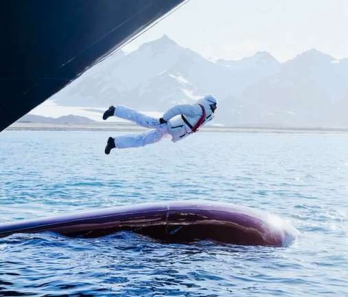 El fotógrafo francés Mathieu Forget, reconocido por sus impresionantes imágenes de paisajes extremos, fue captado saltando sobre el bulbo de proa de un barco en la Antártida.