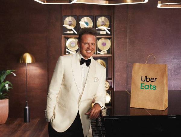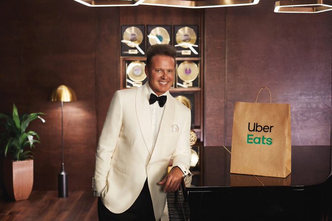 Con un elegante smoking blanco, “El Sol” anunció un servicio de entrega de comida a domicilio y levantó el entusiasmo de sus más fervientes fans.