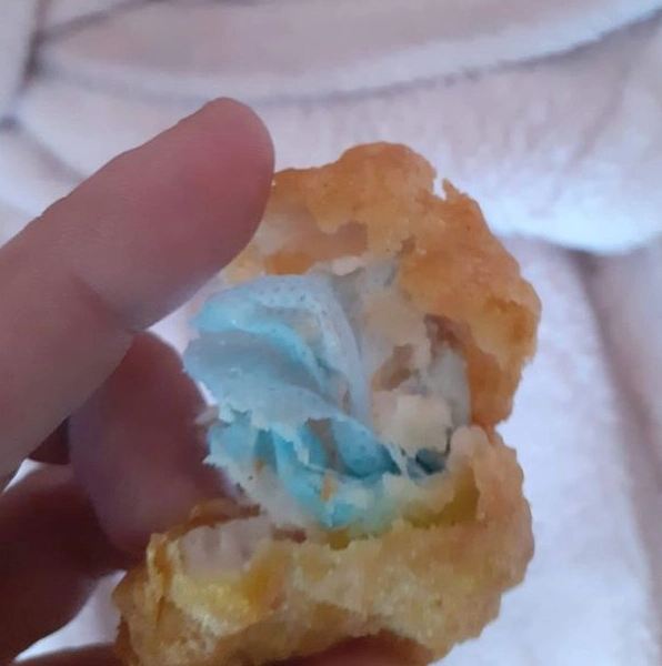 "Mi hija pequeña empezó a ahogarse. Puse mis dedos en su garganta para que saliera, solo estaba azul con los enfermos. Ni siquiera pensé que podría ser el nugget de pollo, pero miré la caja y todo lo que pude ver fue este azul saliendo de otra nugget de pollo en la caja de 20", explicó Laura Arber, madre de la pequeña.