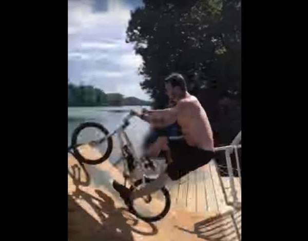 Pero justo cuando estuvo en el aire, no logró mantener la estabilidad necesaria y terminó soltando la bicicleta, que impactó en el muelle, mientras que él se golpeó la cabeza con la rampa y luego cayó en el lago.