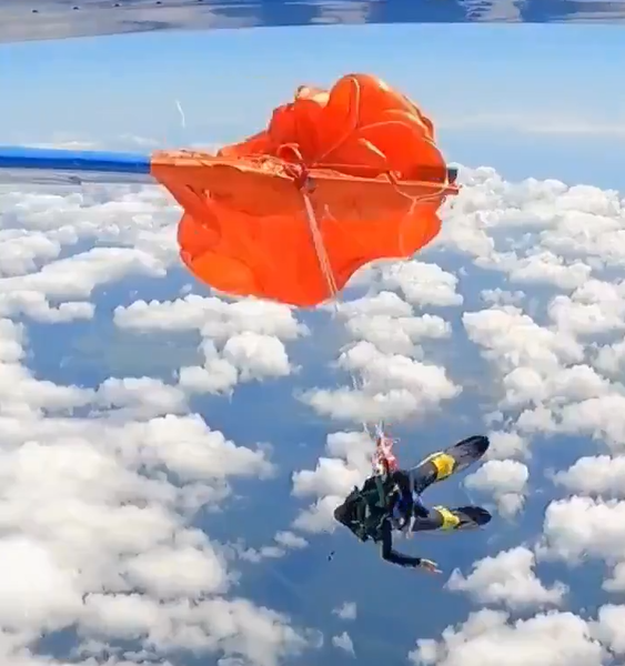 En el video se puede observar cómo la fuerza del paracaídas abierto lo arrastró con fuerza hacia la cola del avión, quedando atrapado. Según los compañeros del paracaidista, el accidentado tuvo que golpear el estabilizador izquierdo, causando daños al avión y a sus propias piernas.