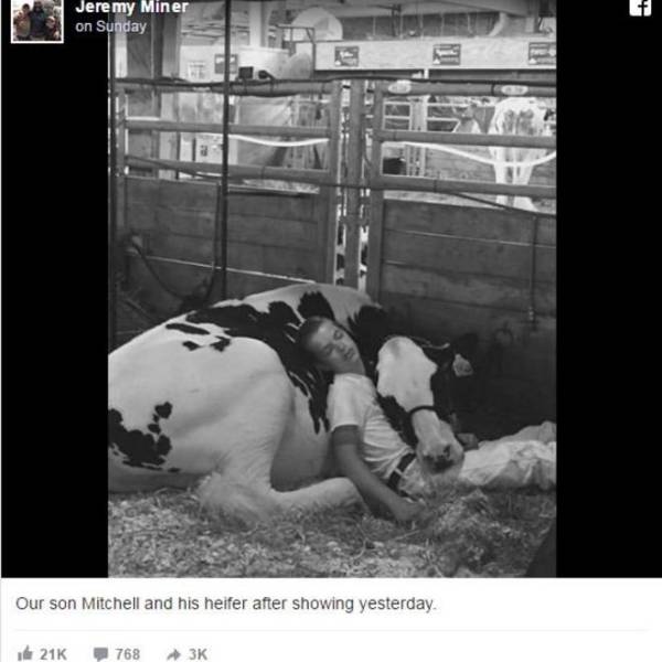 La estrecha relación de confianza entre un adolescente granjero y la vaquilla que tuvo a su cuidado quedó plasmada en una foto tomada por el padre del joven y publicada en Facebook.