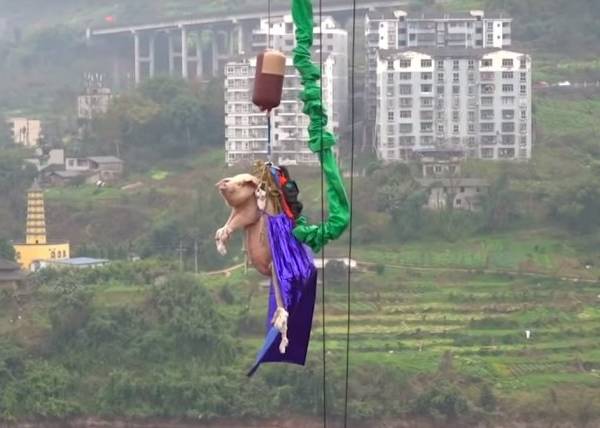 Ahora, el cruel hecho ocurrió en Chongqing, un municipio al suroeste de Pekín, en el parque temático The Meixin Red Wine Town. Como parte de la inauguración de un nuevo juego, disfrazaron con una capa a un cerdo vivo, lo ataron a una cuerda de bungee jumping y lo tiraron al vació desde 70 metros de altura.