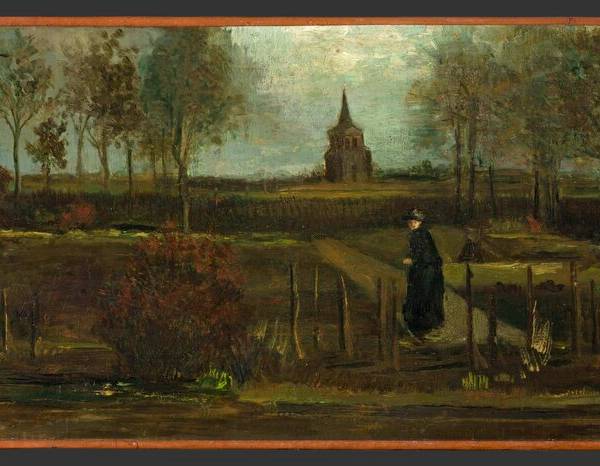 El óleo sobre papel de 25 por 57 centímetros (10 por 22 pulgadas) muestra a una persona parada en un jardín rodeado de árboles, con la torre de una iglesia al fondo.