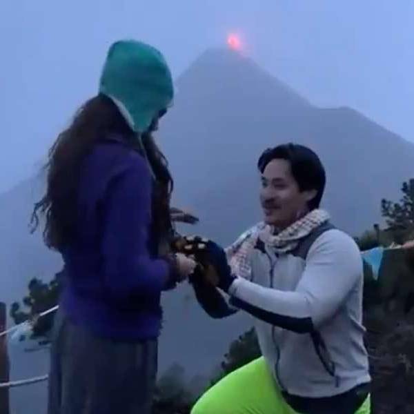 La feliz pareja presumió su propuesta de matrimonio inolvidable frente al volcán.