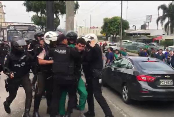 Cuatro estudiantes de medicina fueron detenidos, acusados de haber agredido a uniformados, durante una protesta por la reducción de los pagos en sus prácticas profesionales, desarrollada la tarde de este martes 14 de mayo en Guayaquil.