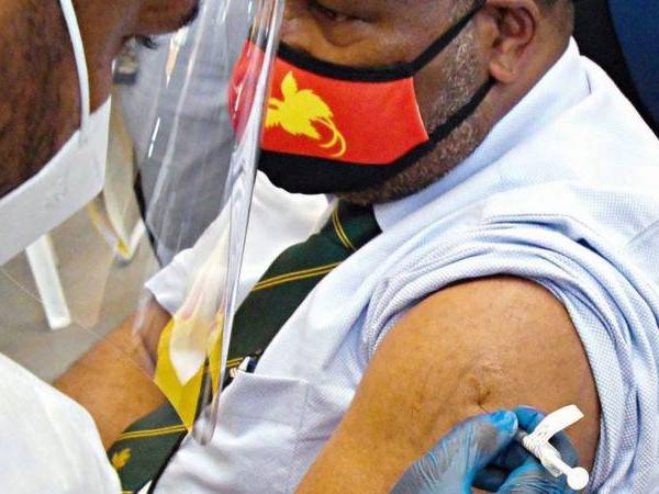 El primer ministro de Papúa Nueva Guinea, James Marape, recibe la vacuna de covid-19 en una campaña para frenar la rampante propagación de coronavirus en ese país del Pacífico.( )