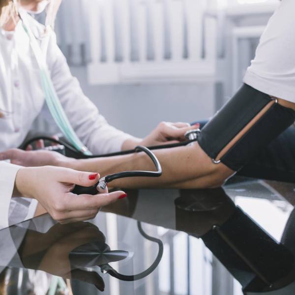 Doctora midiendo la presión arterial. ( )