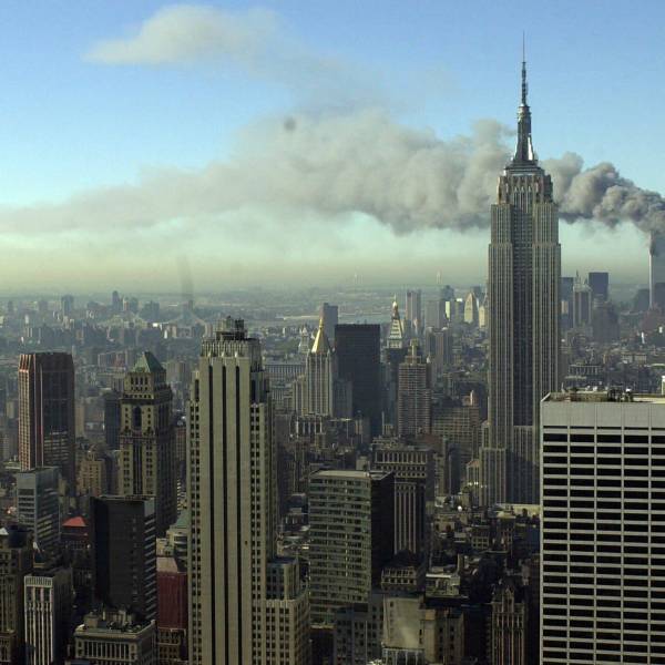 El humo se extiende sobre la ciudad de Nueva York después de que dos aviones secuestrados fueron estrellados en las torres gemelas el 11 de septiembre de 2001. ( )