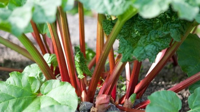 Los tallos de ruibarbo se usan en muchos platos y postres. Pero las hojas no son aptas para el consumo.