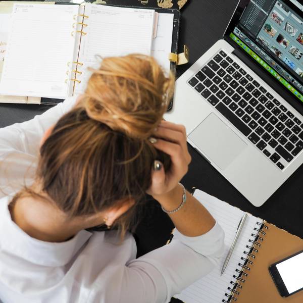 Chica con ansiedad y estrés frente a su Macbook mientras trabaja( )