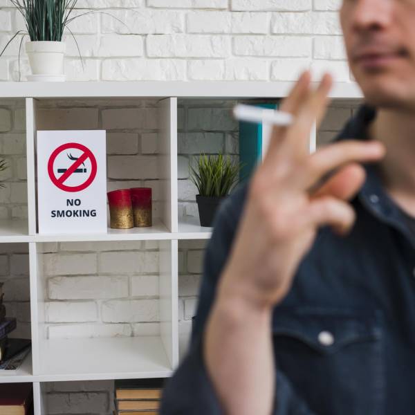 Hombre fumando en un lugar que no es permitido consumir tabaco.( )