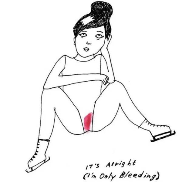 La leyenda dice: 'Está bien. (Sólo estoy sangrando)', reciclando y dándole un giro feminista al título de la canción de Bob Dylan "I'm alright, Ma (I'm only bleeding)".( )