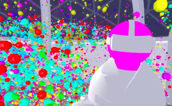 Dentro de un laboratorio "virtual", el profesor Hannon y yo nos convertimos en avatares. El cáncer está representado por una masa de burbujas multicolores.