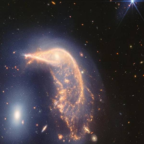 El telescopio espacial James Webb celebró su segundo aniversario de operaciones con una impresionante imagen. Esta muestra el baile de dos galaxias entrelazadas, NGC 2936 (el Pingüino) y NGC 2937 (el Huevo), conocidas en conjunto como Arp 142.
