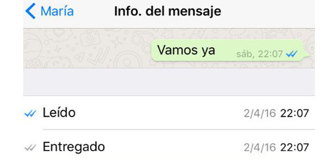 Ahí podrás comprobar quién ha leído el mensaje y a qué hora lo ha hecho (con el famosos doble click azul). En cambio, quien no lo haya hecho aparecerá abajo del todo en el apartado "entregado", es decir, que le ha llegado pero no lo ha visto.