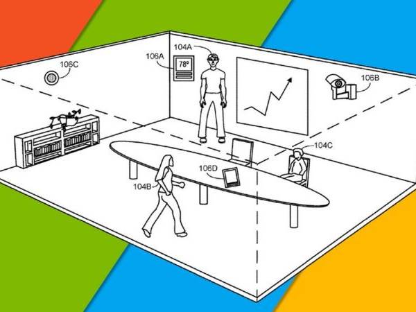 Sensores en una sala de reuniones están etiquetados en este esquema de una solicitud de patente de Microsoft.