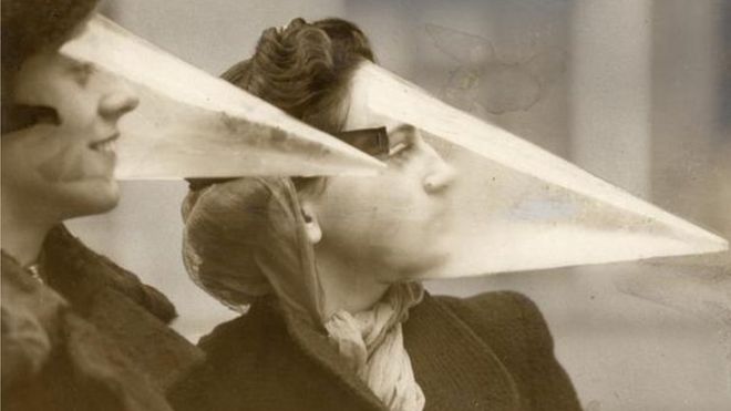 No hay mucha más información disponible sobre este extraño aparato triangular que no sorprendería ver hoy día en una coreografía de Lady Gaga.