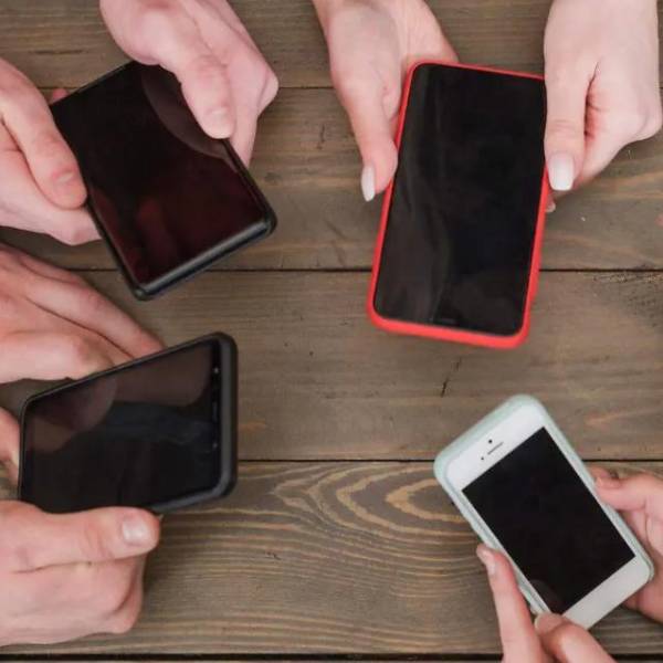 Personas con celulares en sus manos.( )
